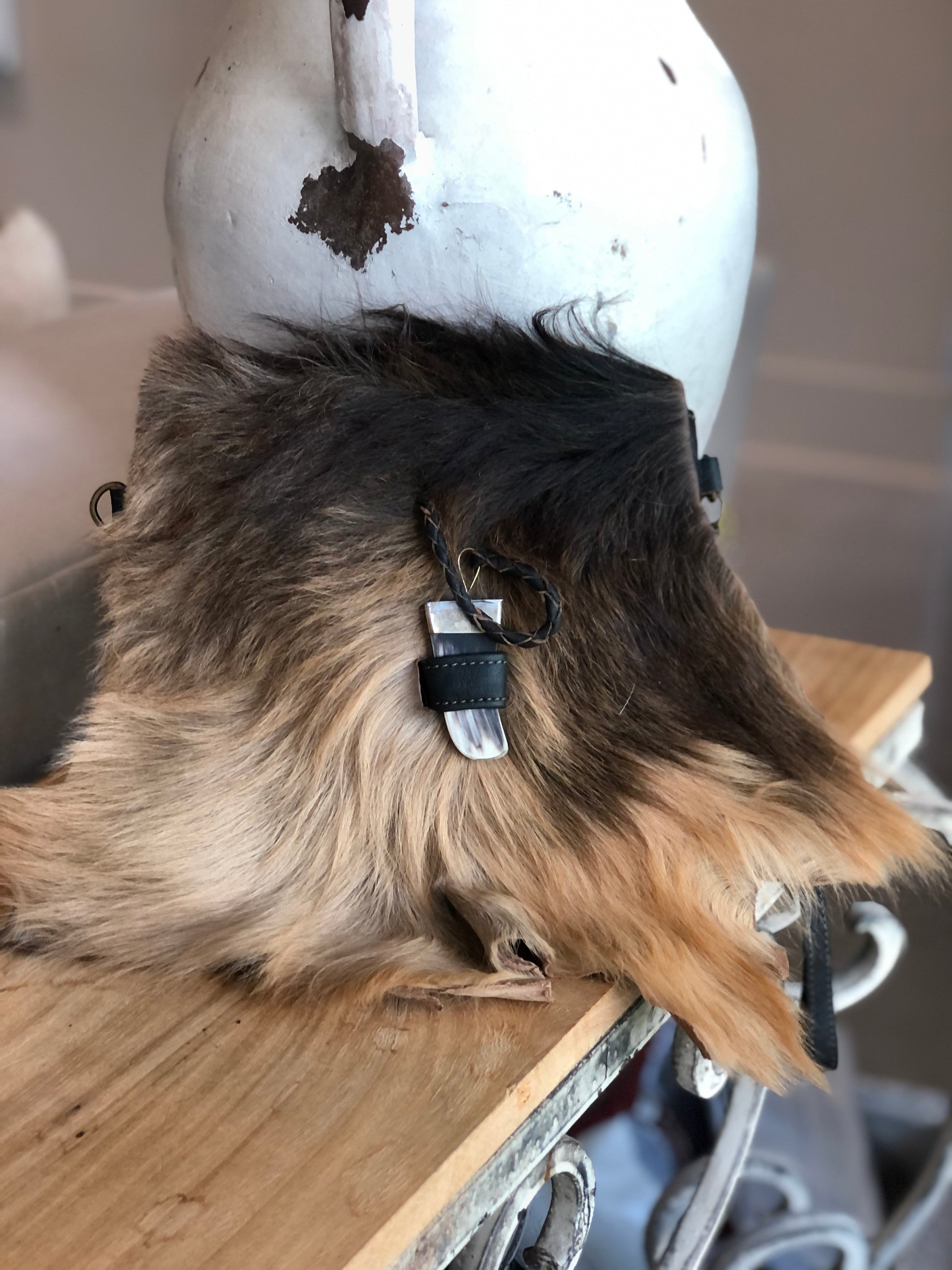 Long hair fur . black leather bag 3 zipper pockets. Comes with wristlet & adjustable waist belt.