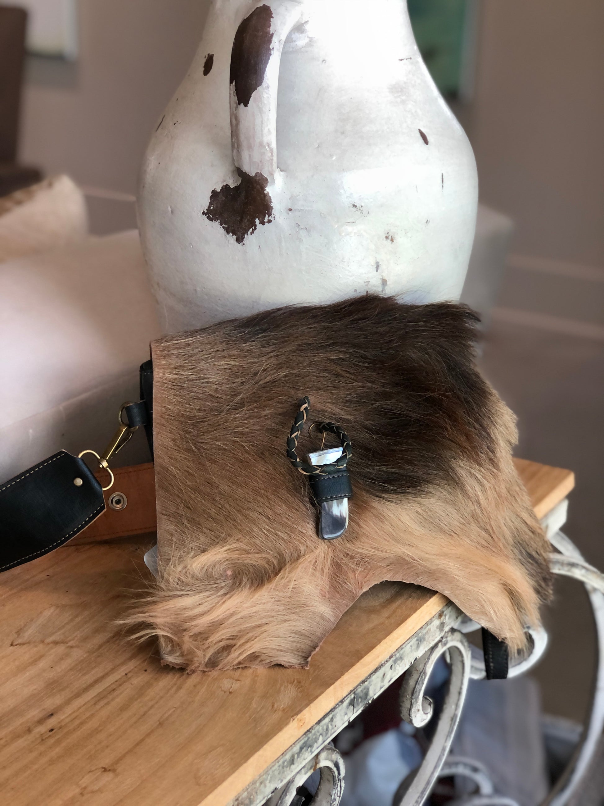 This beautiful fur front bag comes With three zipper pocket , wristlet and adjustable waist strap. 7x9