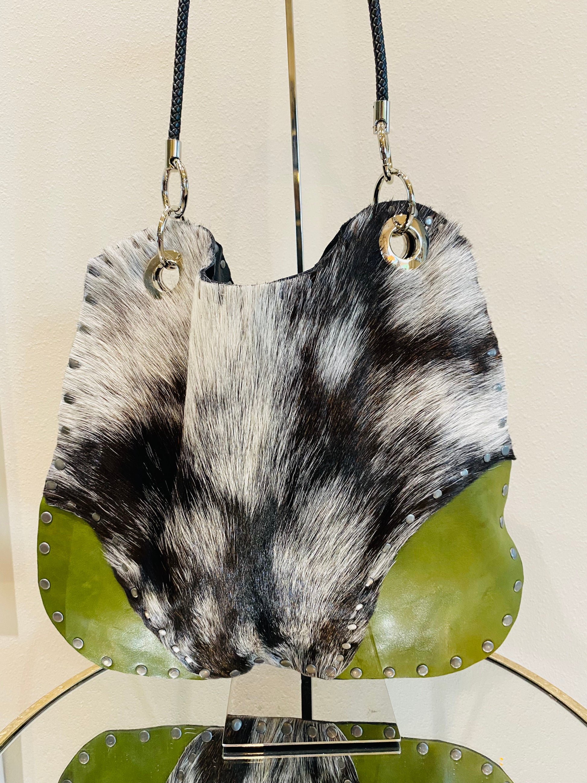 Beautiful handmade custom alpine fur bag with green Italian leather embellished with gunmetal rivets . This large 14x14 bag comes fully lined with a large pocket in the bag large enough to carry a cell phone . Comes with a shoulder strap .