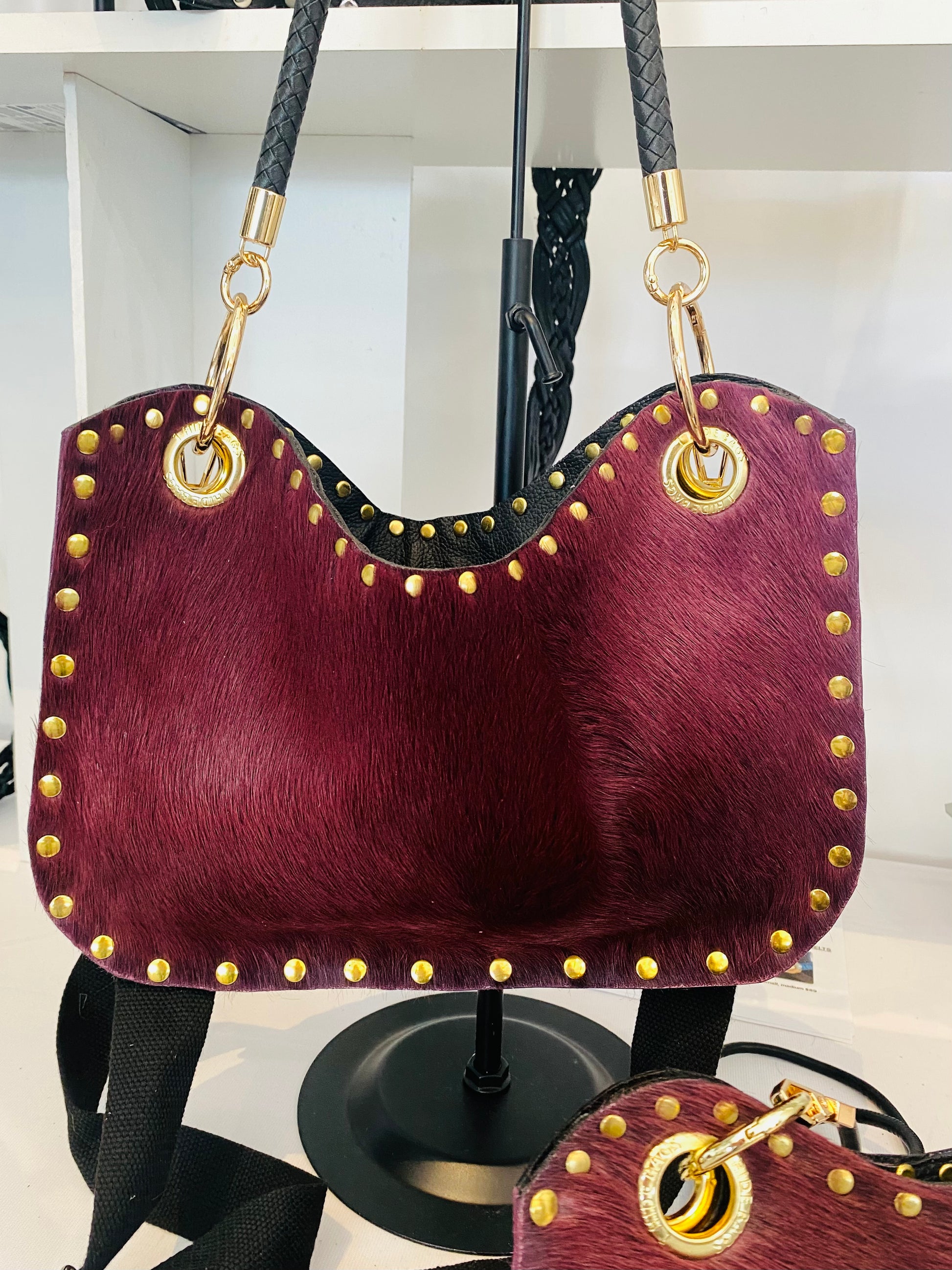 Beautiful berry fur and Italian leather bag . There’s 7 x 10 bag is fully lined with a snap closure and a back pocket large enough to carry a cell phone. Comes with a Crossbody strap and a shoulder strap.