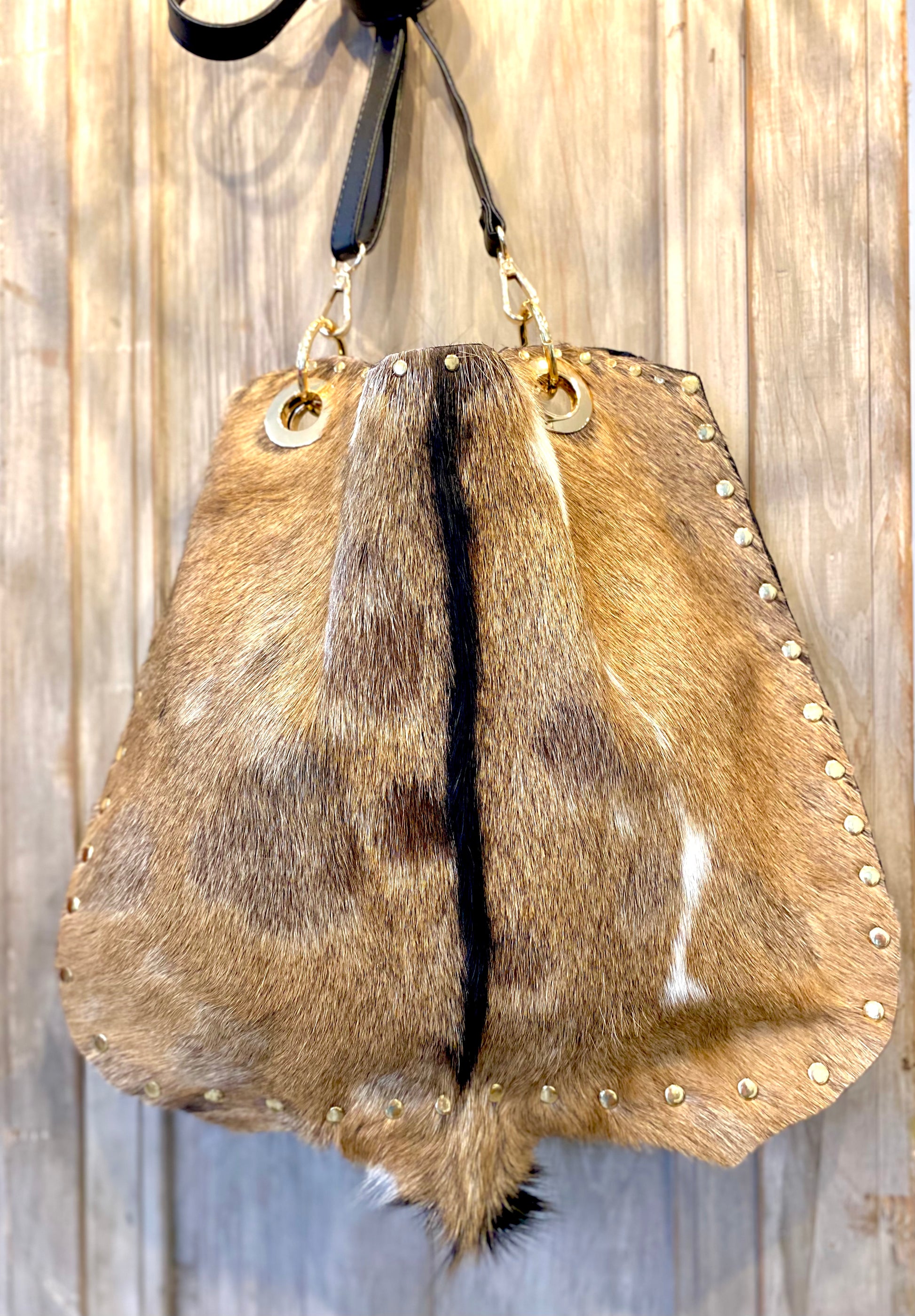 Beautiful tan , cream and black fur front . This 12x14 bag is Made with black Italian leather backing and lining . Bag comes with adjustable crossbody and shoulder strap.