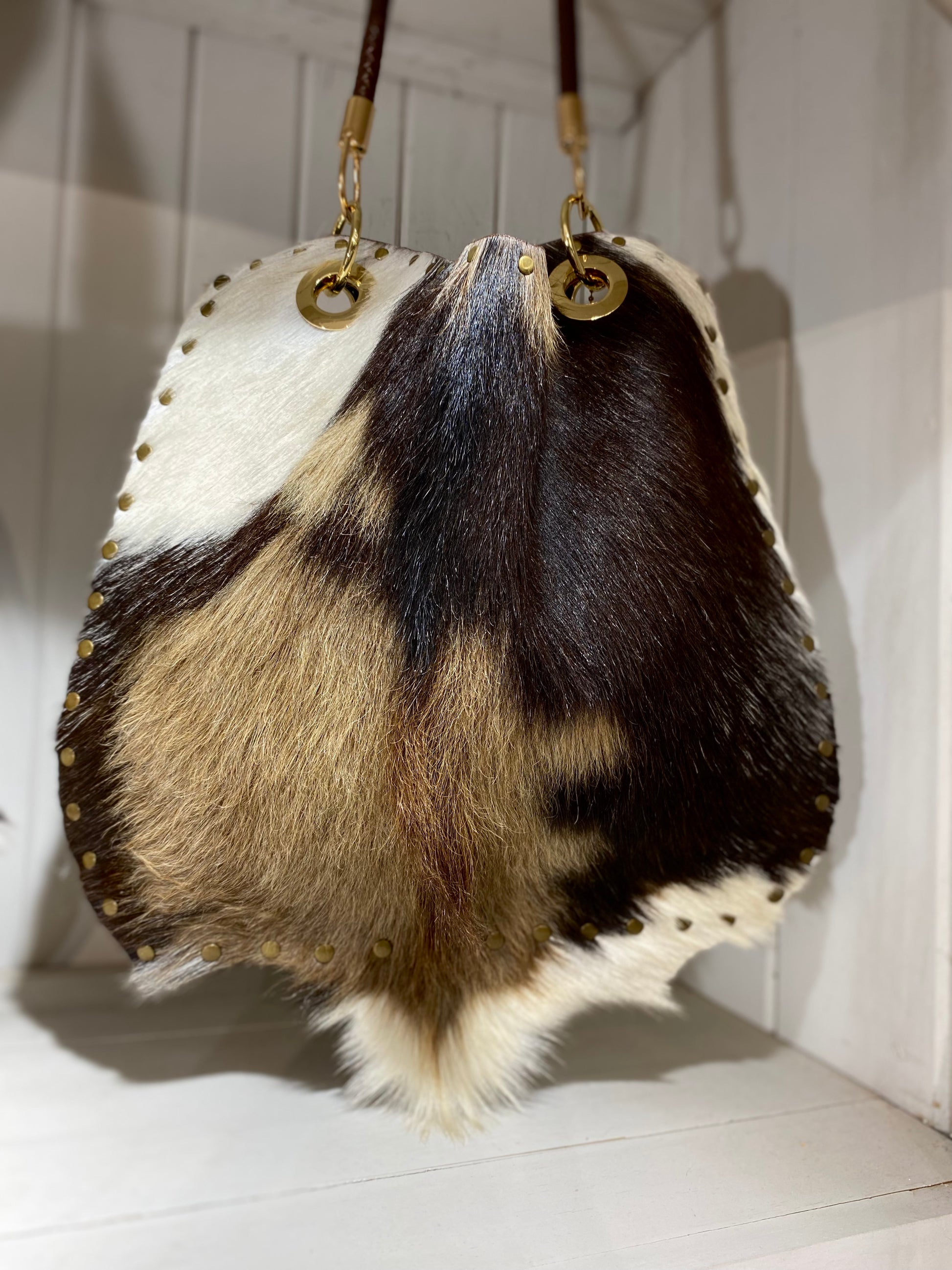 Gorgeous calico colored French alpine goat fur front bag with black Italian leather backing company by dark gray rivets and silver hardware.