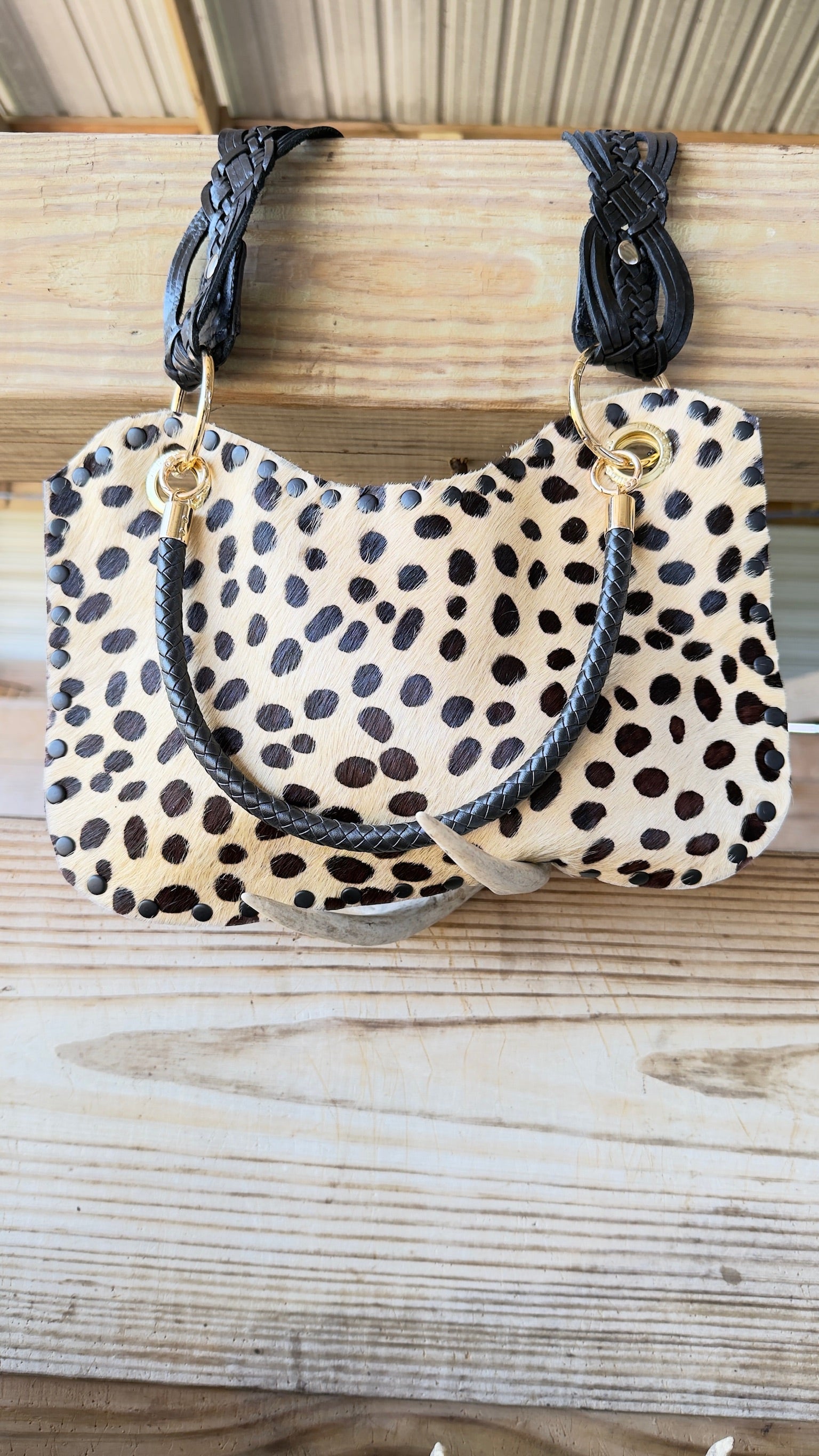 Gorgeous rich cowhide cheta fur bag made of beautiful black leather back embellished with brass rivets. This 12 x 12 Crossbody bag comes fully lined with snap closure and outside pocket that is large enough to carry a cell phone and a beautiful woven Crossbody strap comes in chocolate or black.