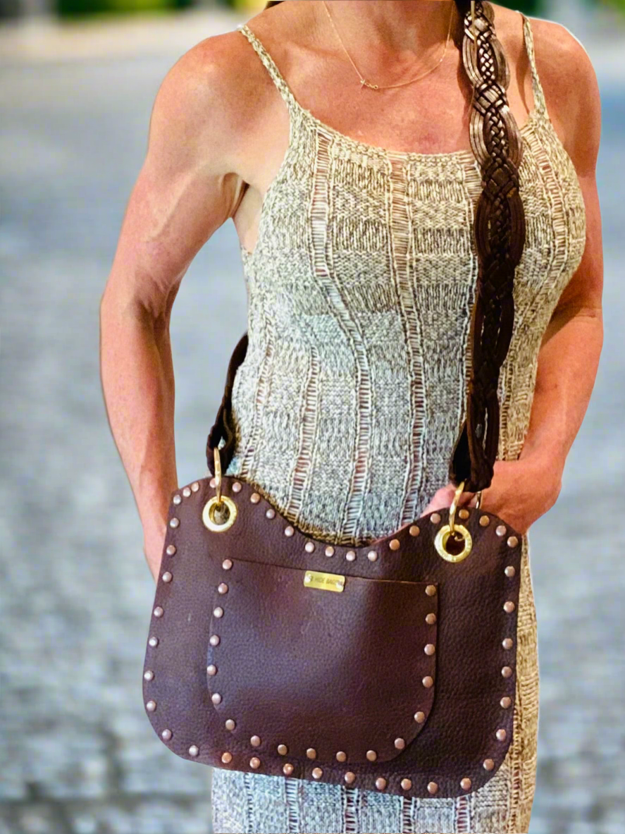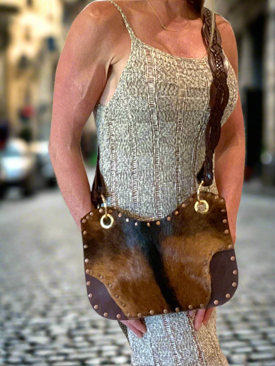 Beautiful brown , buffalo leather bag, embellished with brass rivets and calico fur . this 12 x 12 bag comes fully lined with a snap closure and a back pocket large enough to carry a cell phone. Comes with a woven black Crossbody strap and a shoulder strap.