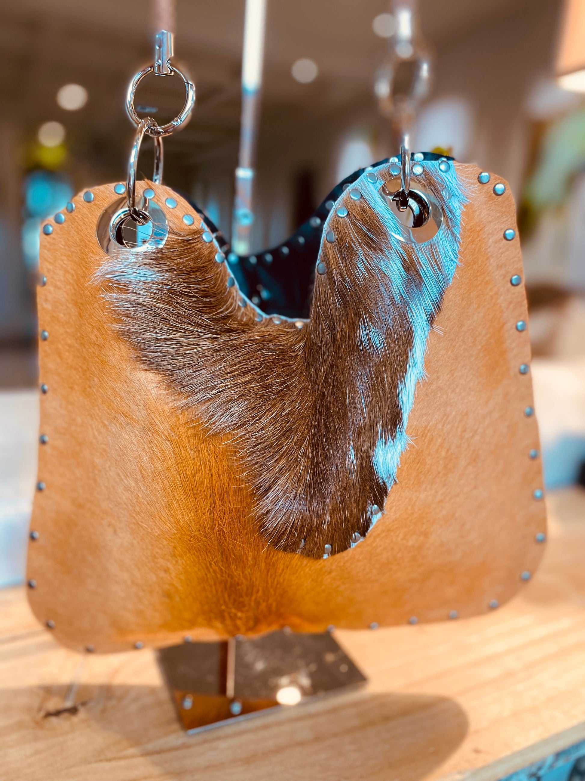 Stunning burnt orange fur front bag with accompanying burnt orange leather backing . This 12x14 bag is one of a kind with its embellishment of New Zealand goat fur .