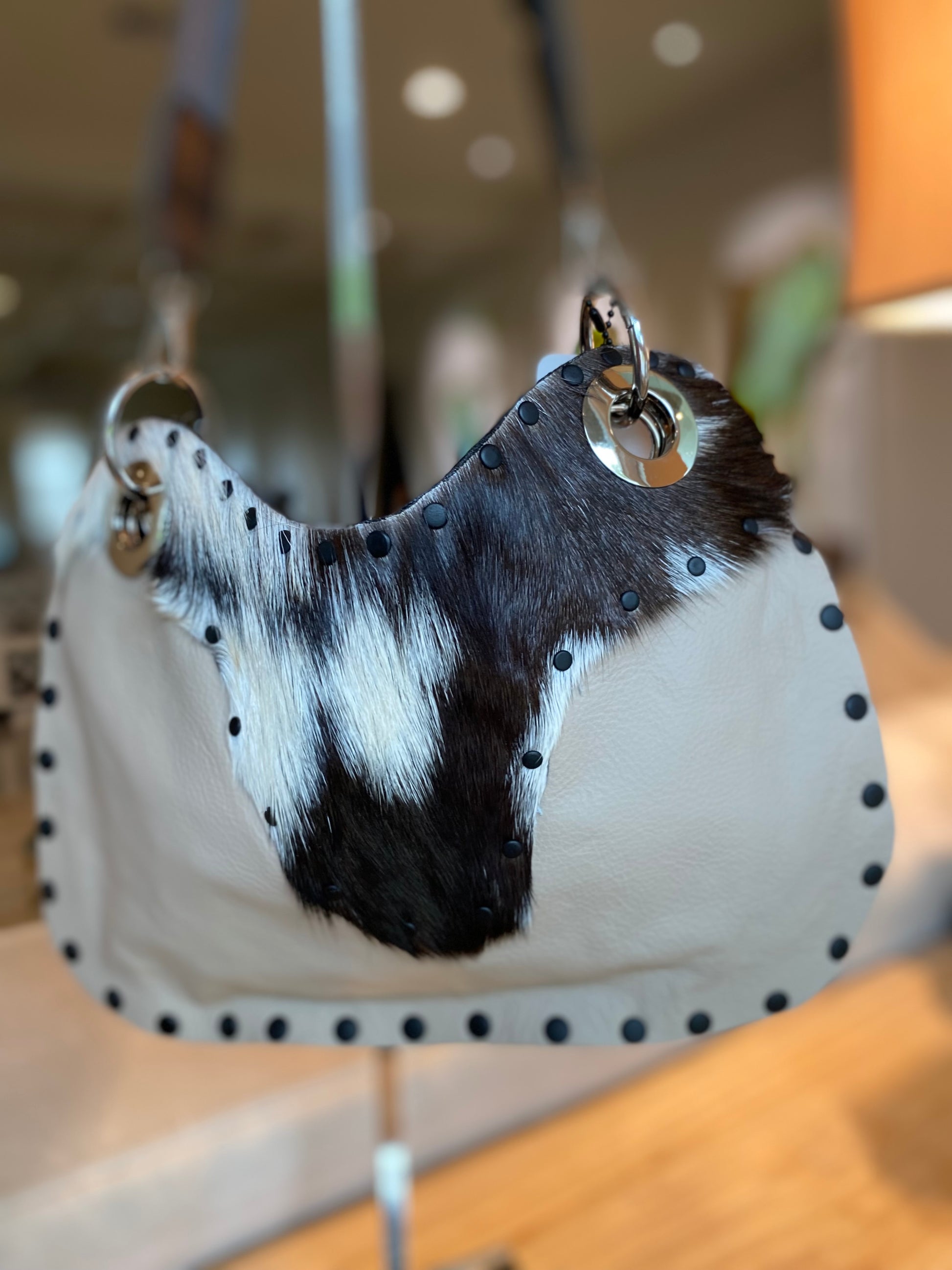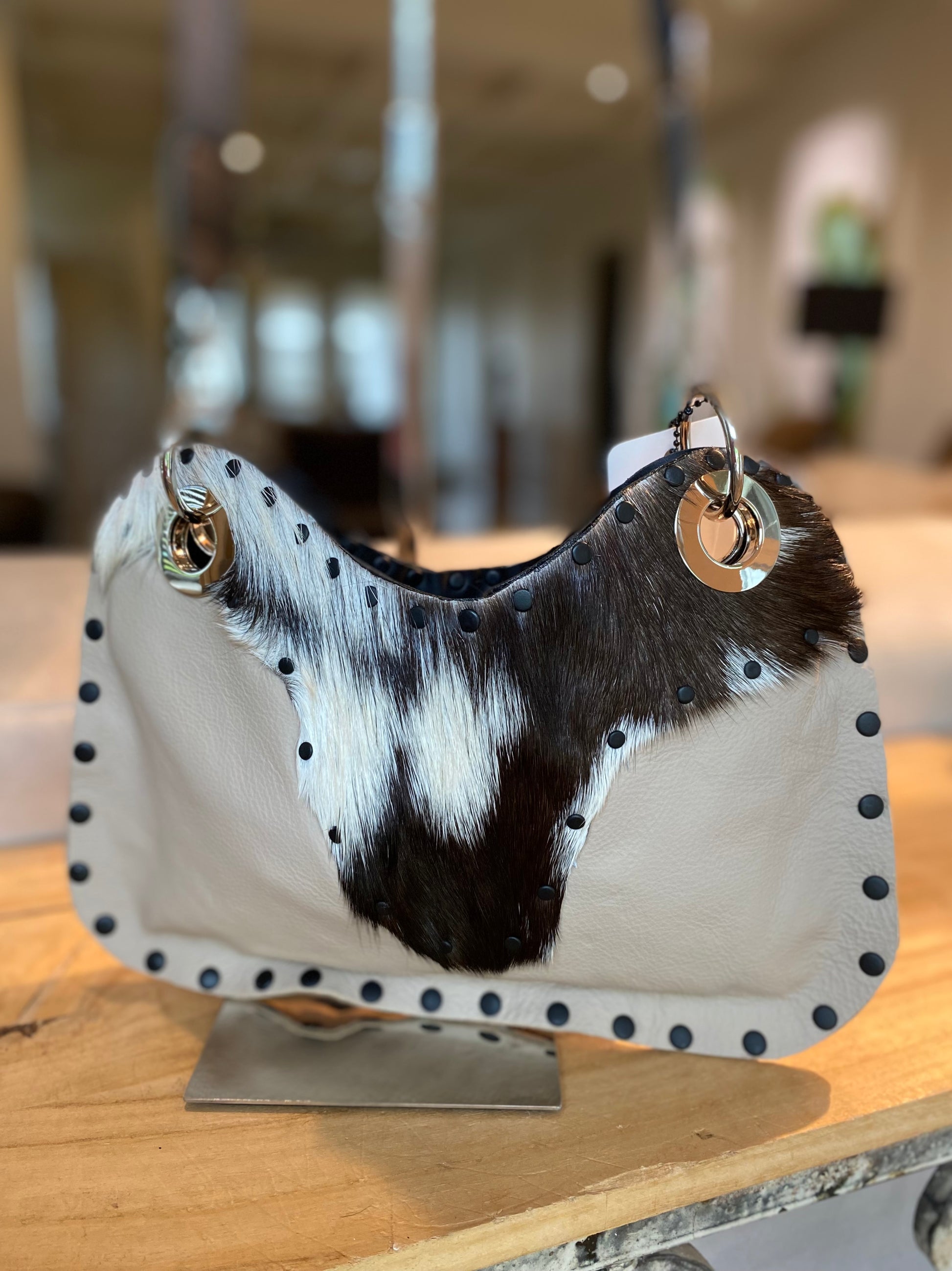 Tan leather bag with New Zealand goat fur on front of bag . This 10x12 bag comes fully lined with a large back pocket.