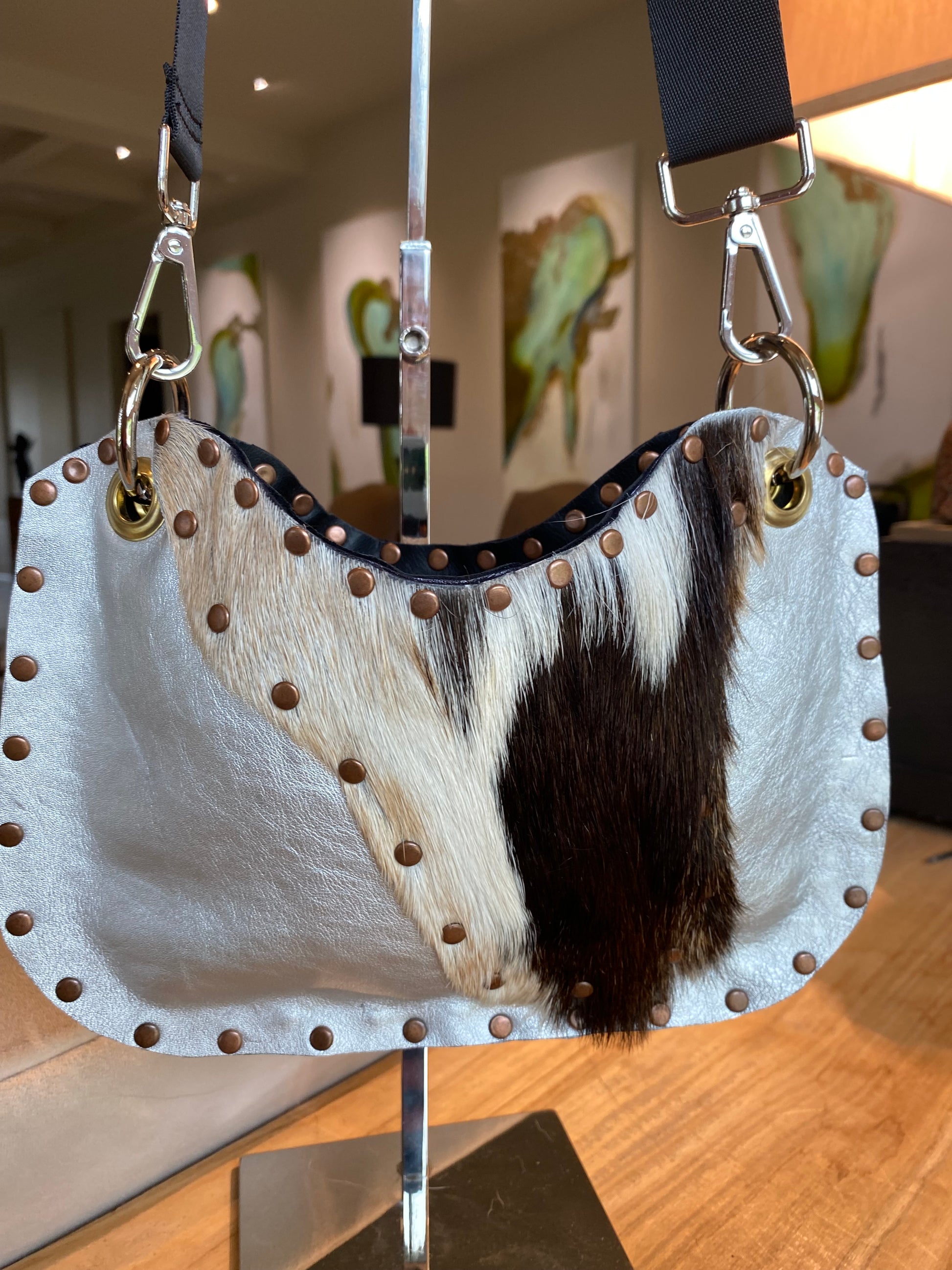Fantastic silver metallic bag with a hint of fur front. This bag comes fully lined with a snap closure, large pocket and back And black Crossbody strap.