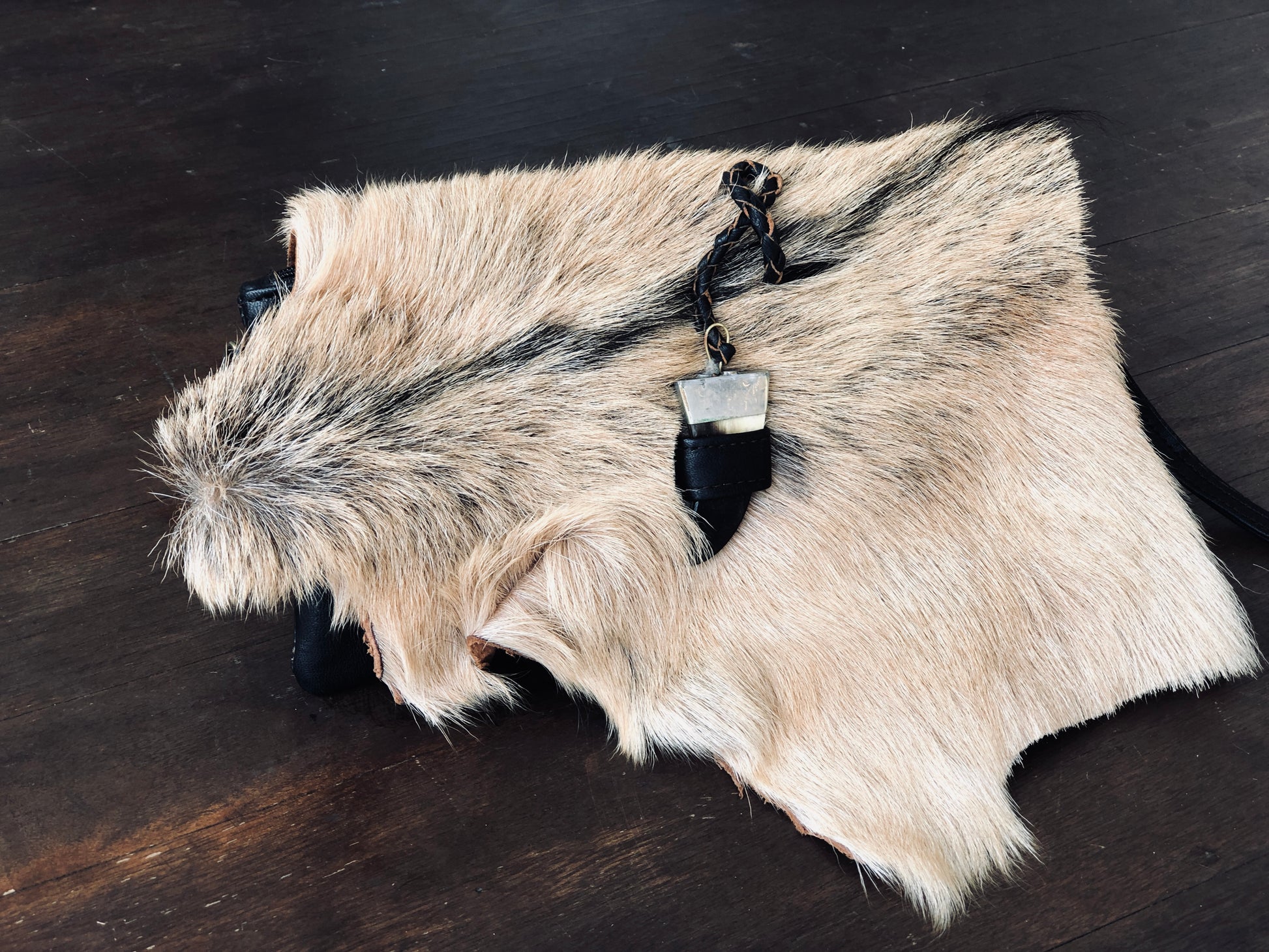 Tan 3 zipper bag . fur front w/ shell tigers tooth closure . 12x5 bag