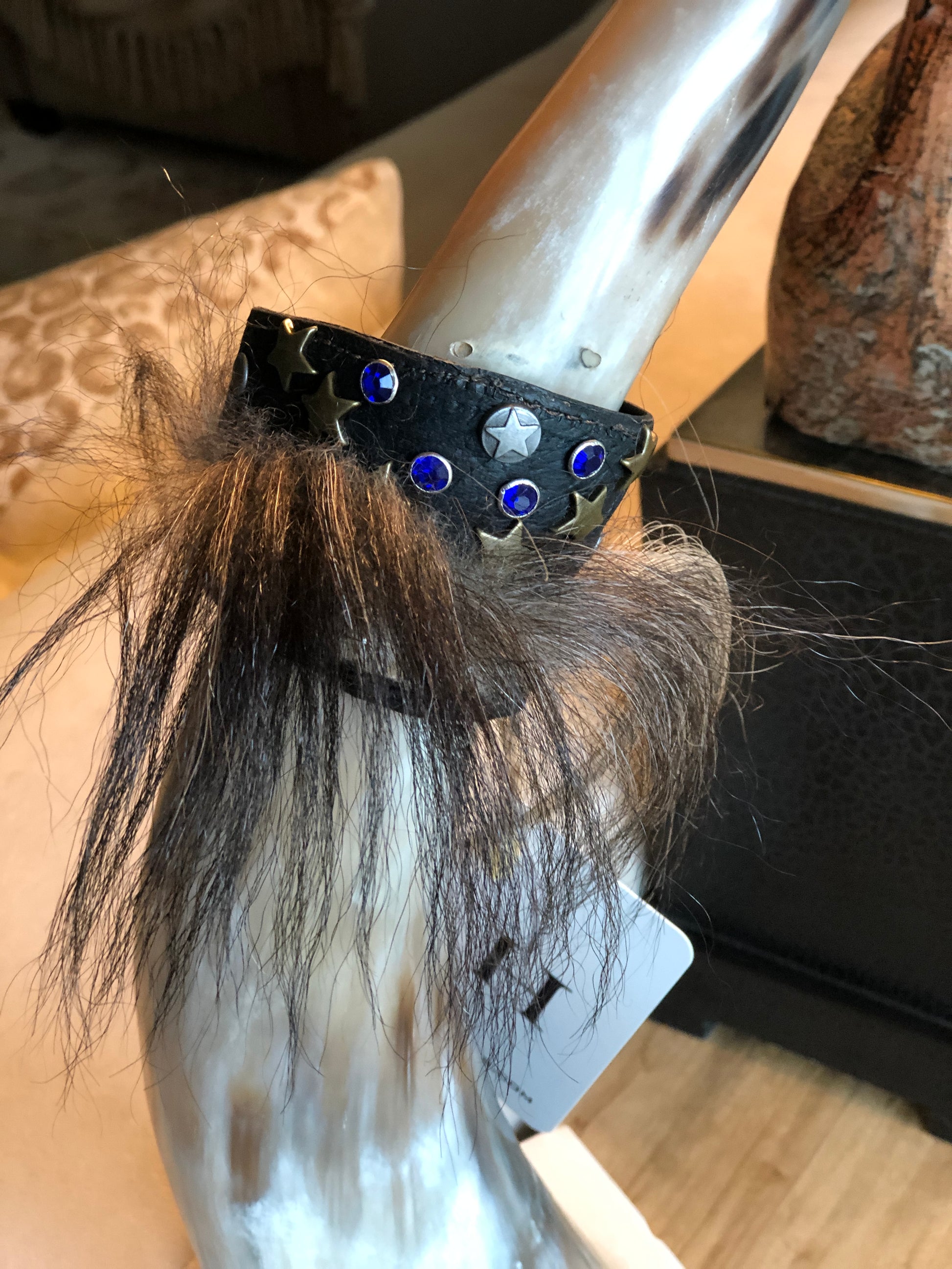 Black leather strap w/ snap closure. New Zealand goat fur, crystals , iron Embellished . One size fits all.