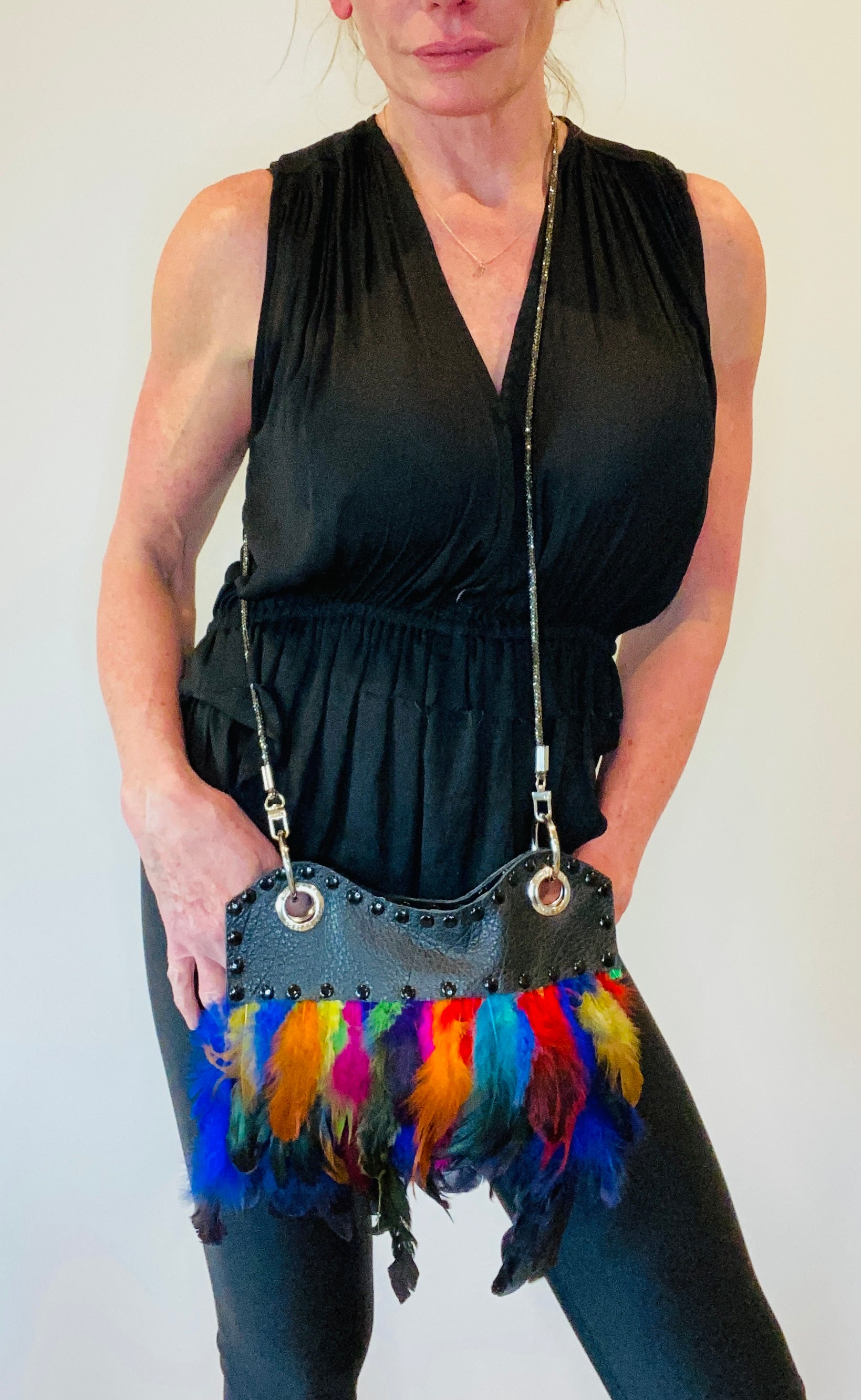 What a fun festive bag ! This 9x9 bag is full of colors. Made with black Italian leather, multicolored feathers and embellished with black rivets. This bag is fully lined with snap closure comes with a back pocket large enough to carry a cell phone.
