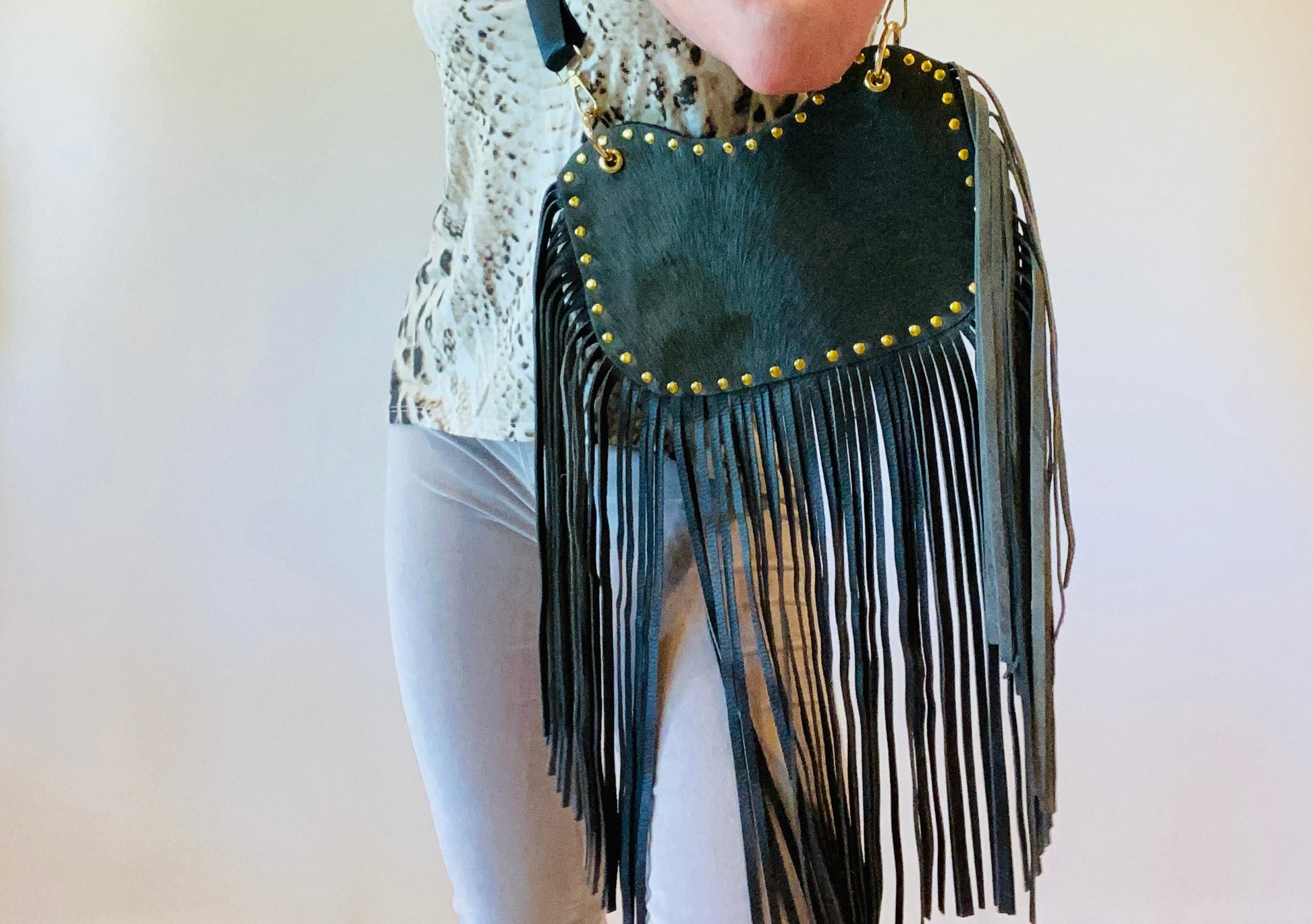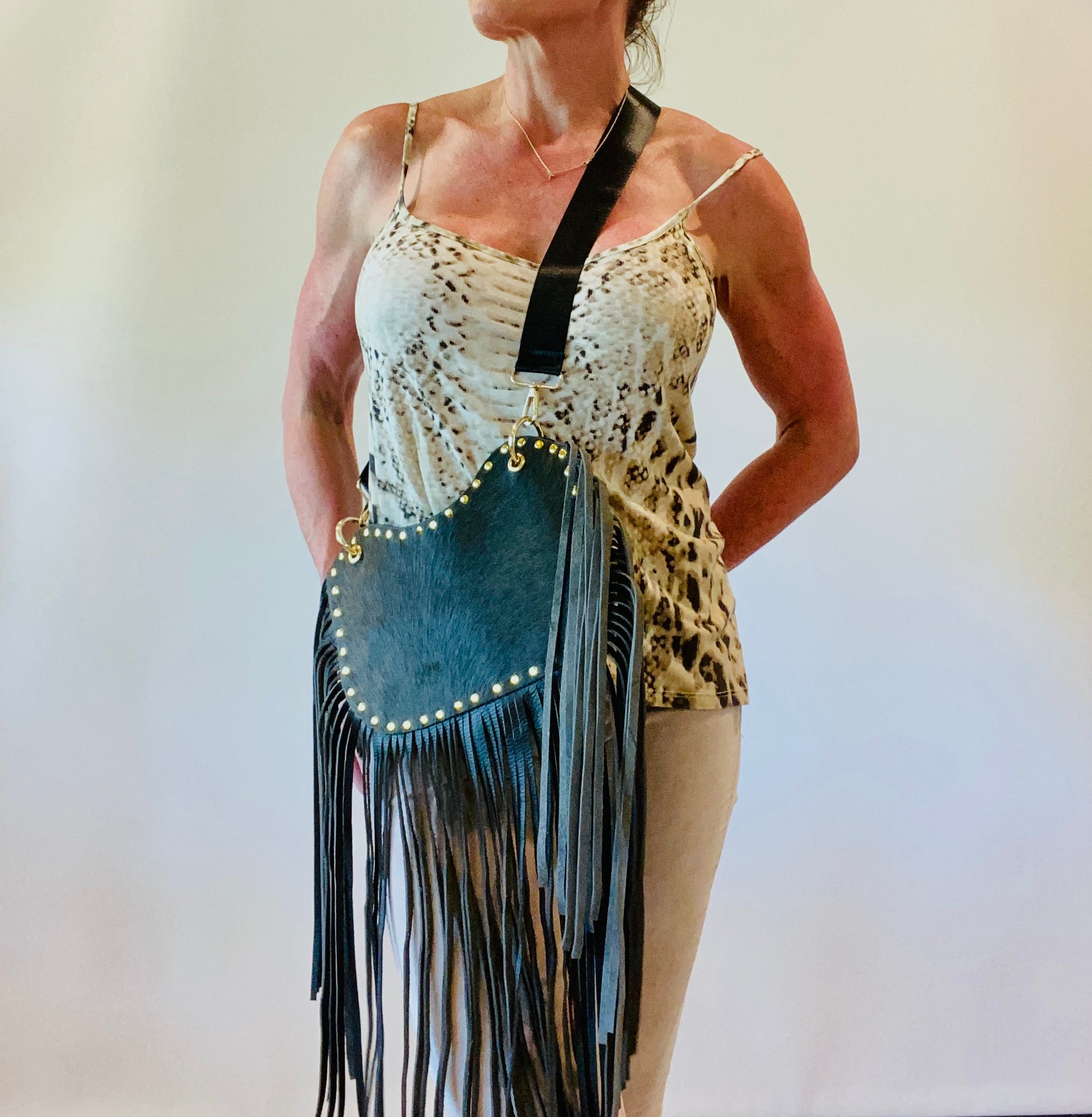 Beautiful gray fur front handbag with Italian leather fringe and backing. This bag is 9 x 13 comes with a back pocket large enough to fit a cell phone & comes fully lined inside with a snap.