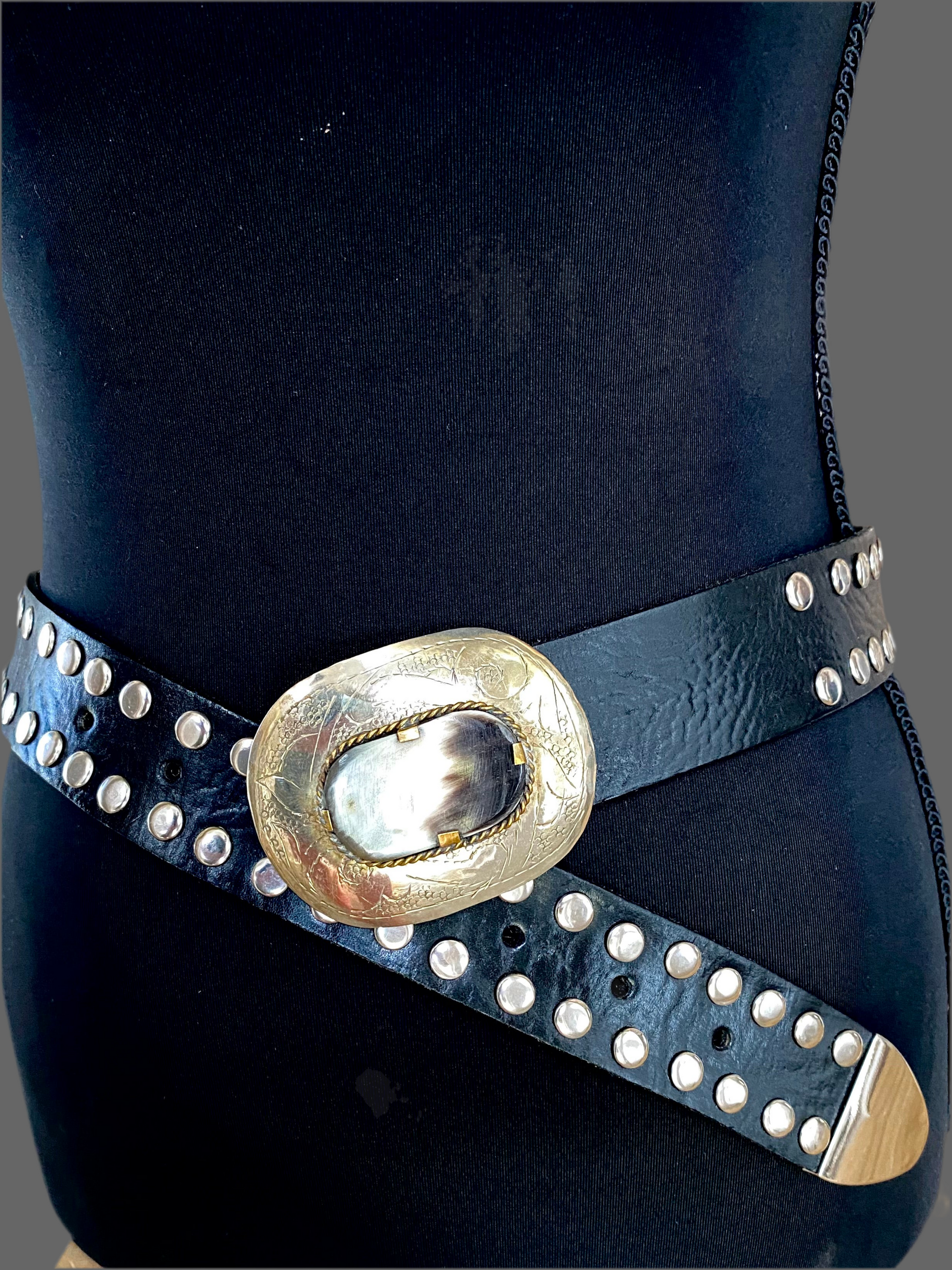 Beautiful black, buffalo leather belt embellished with rivets and a beautiful silver horn buckle. 2 inch thick and up to 46 inches long.
