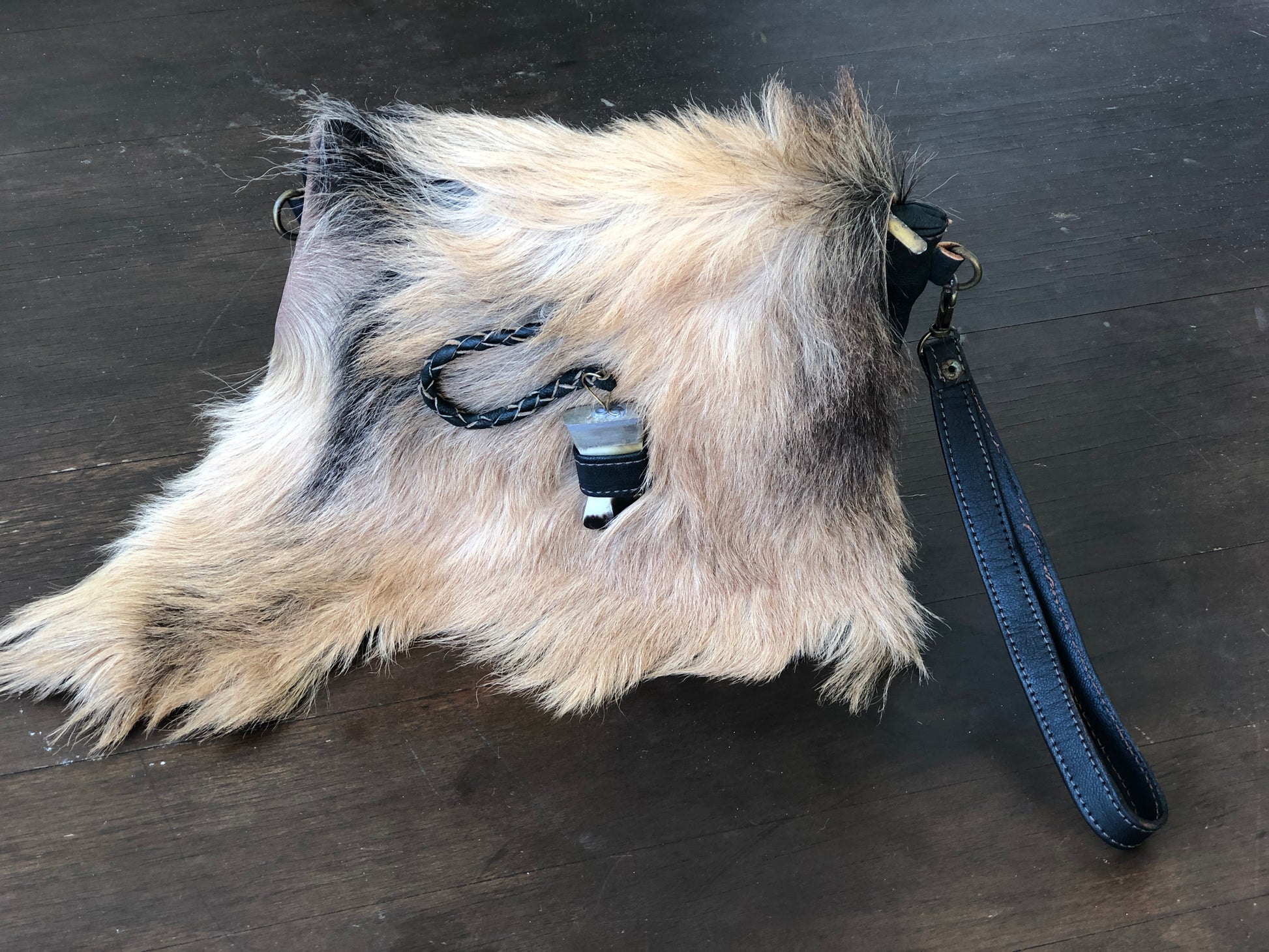 Cream fur with hints of bark grey . Black leather bag wristlet, and adjustable waist strap. Comes with three large zipper pockets. 7x9