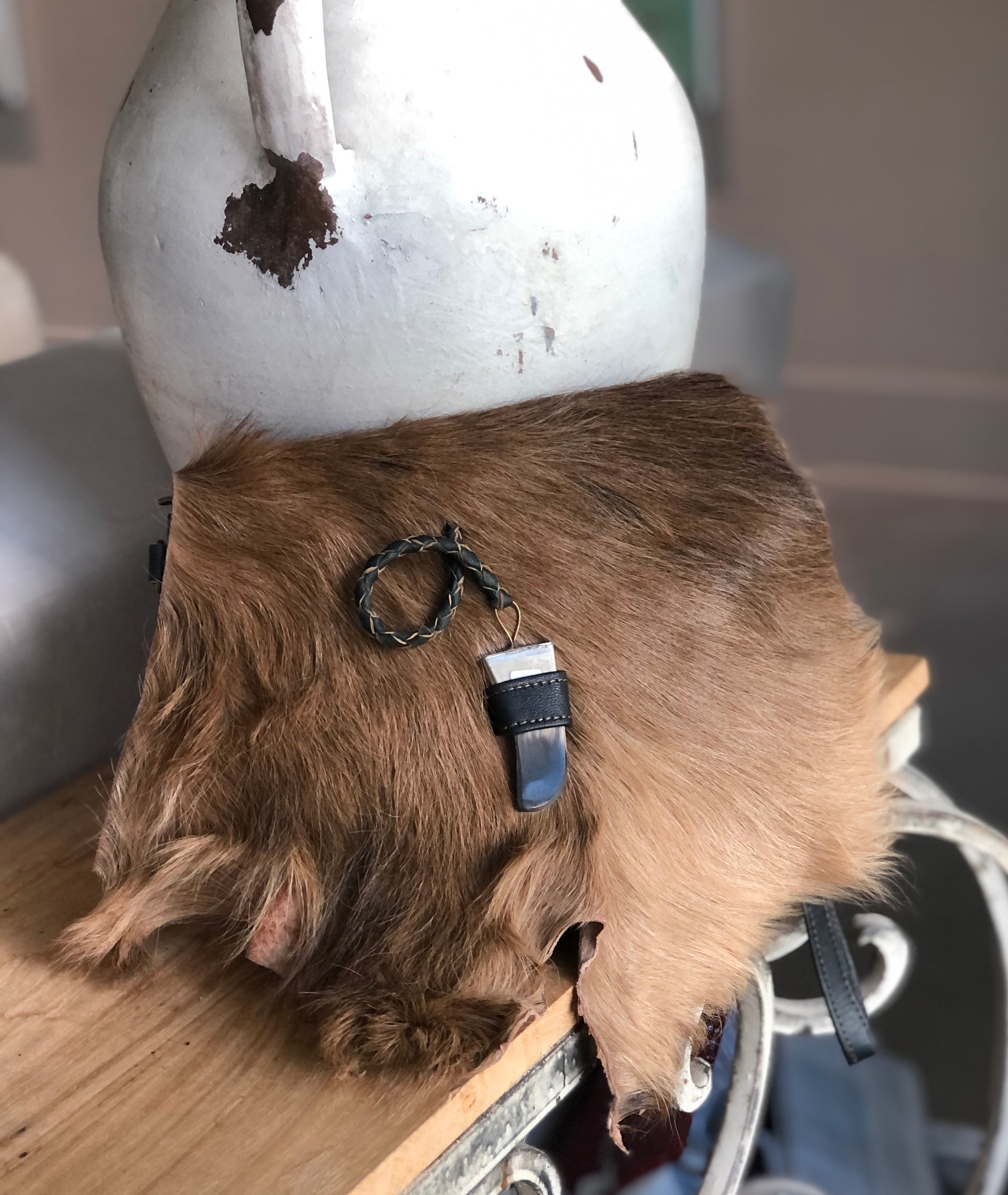 Hombre fur front with black leather bag wristlet and adjustable waist strap. Comes with three large zipper pockets. 7”x 9”