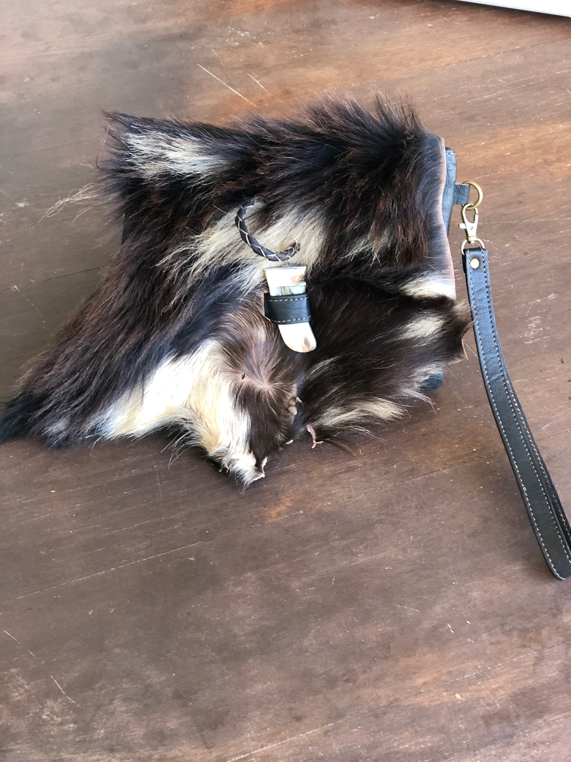 Beautiful dark fur medium length fur front. Black leather bag . Comes with wristlet and waist belt . The bag has three large zipper pockets.