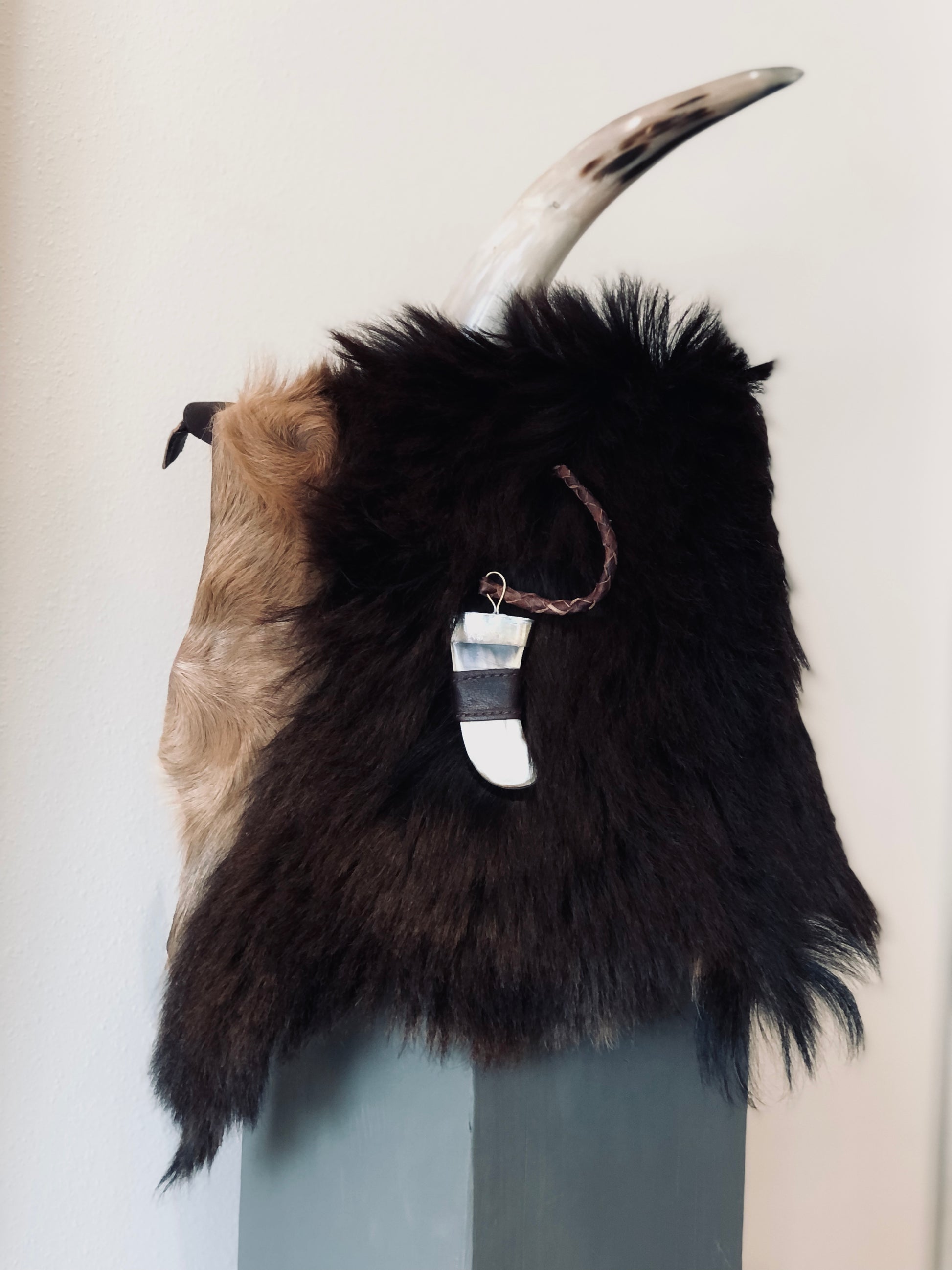 Thick New Zealand buck goat black fur front with a hint of tan . Dark Tan leather bag 10 x 10 with a large zipper pocket in the back. The bag comes with adjustable strap.