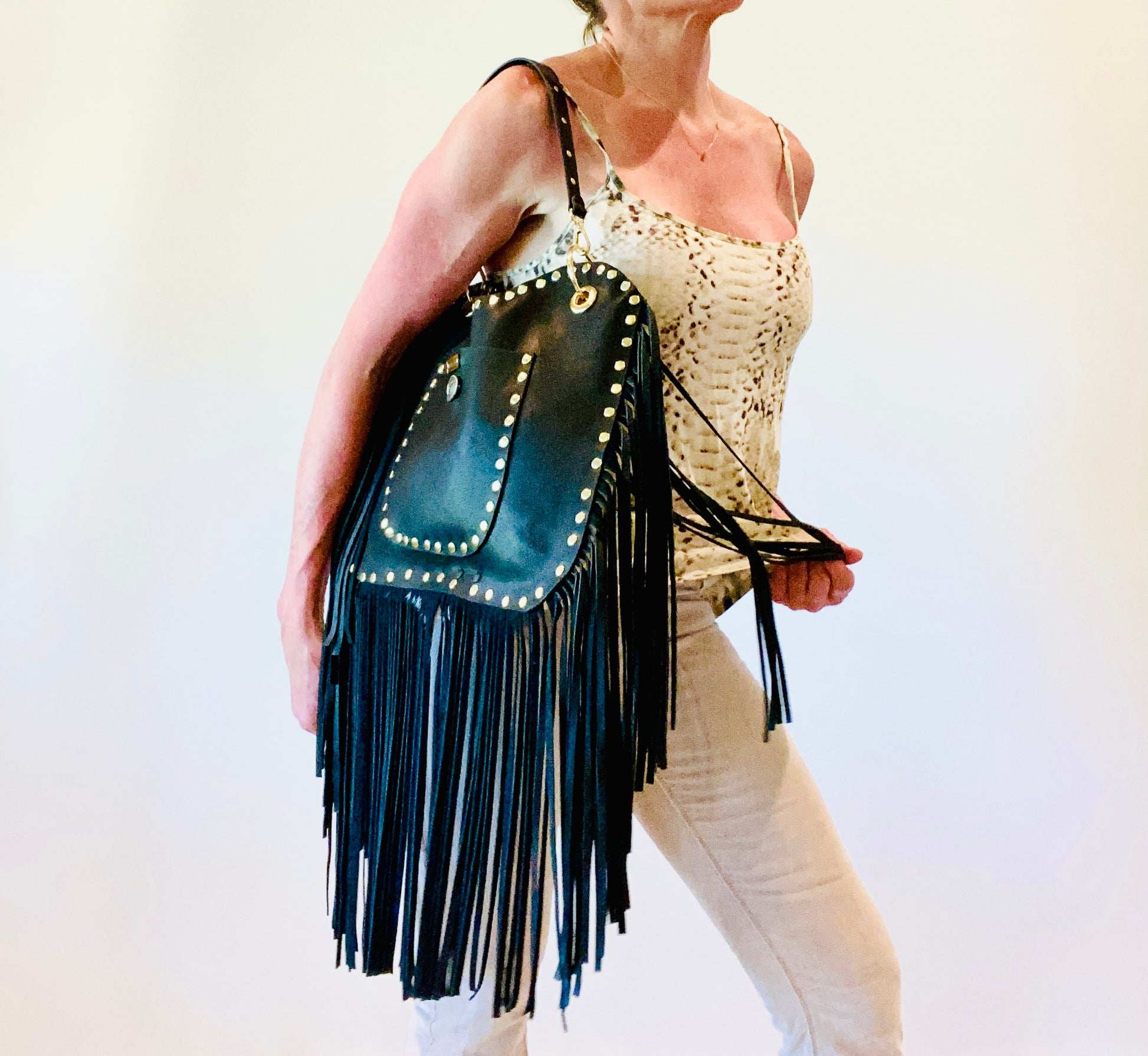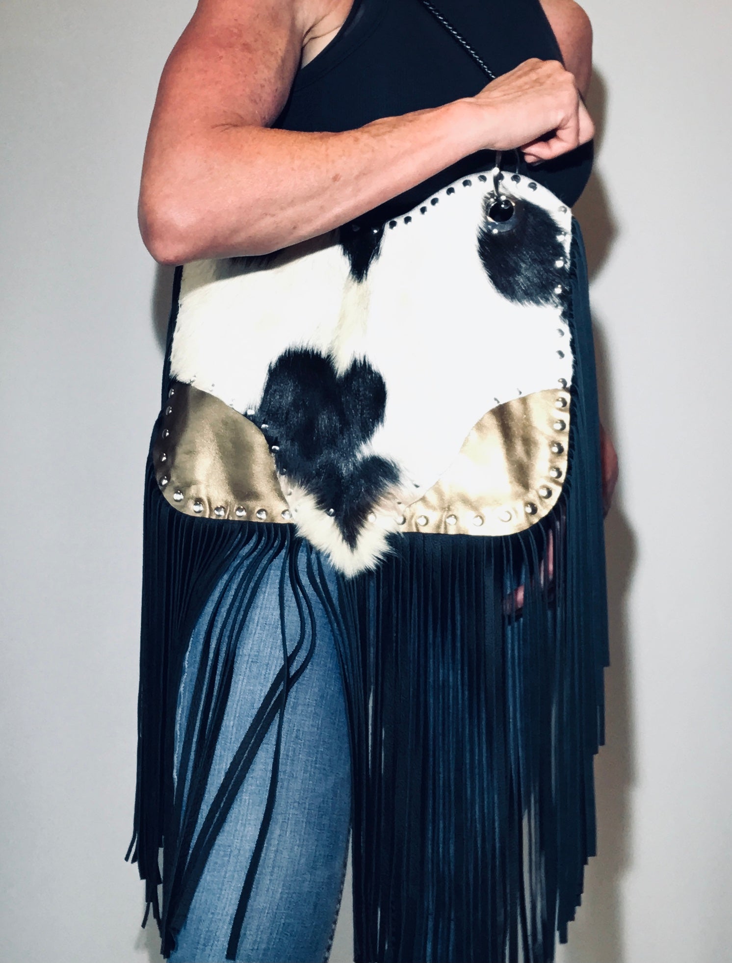 Gorgeous New Zealand goat fur front bag embellished with snake skin , leather fringe and silver rivets. This 14 x 14 shoulder bag comes fully lined , with an outside pocket large enough to carry his cell phone.