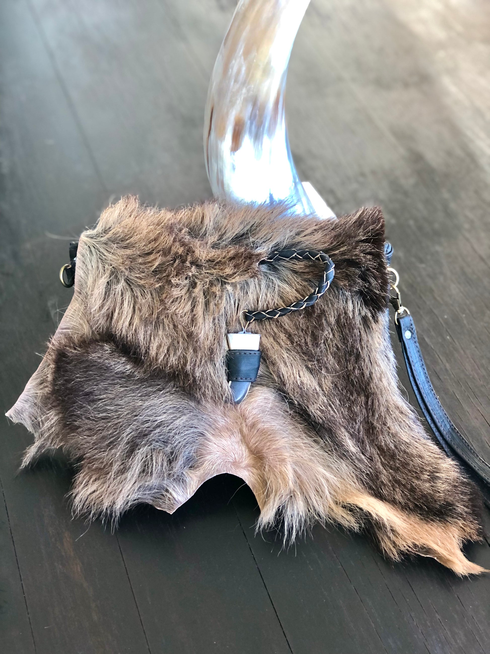 Marge of a gray fur colors in this fabulous furry bag . Fur front with black leather bag three zipper pockets . Comes with restaurant and adjustable belt. Great for holding a wallet keys and phone. 10 x 7