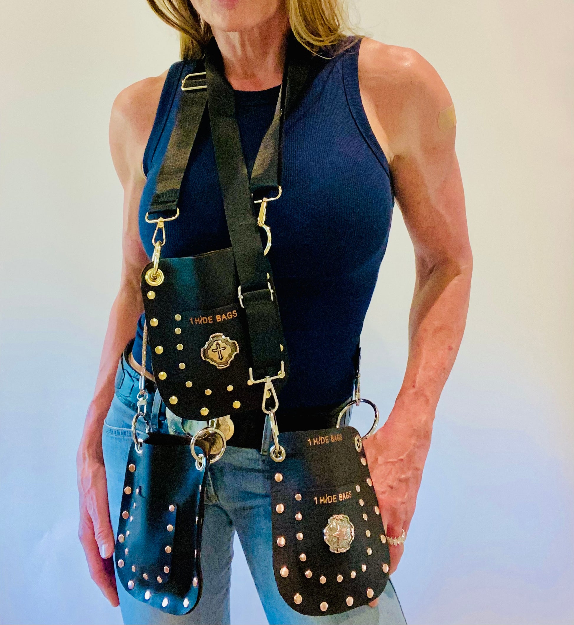 Beautiful copper rivets along the black thick leather bag . This bag is big enough for androids & iPhone’s . Comes with an adjustable crossbody strap.