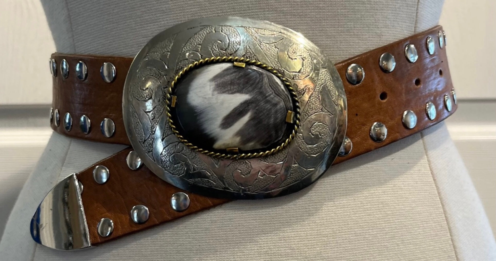 Beautiful buffalo leather belt with rivets . Sterling silver horn buckle . End tipped with silver cap . 24’-36’