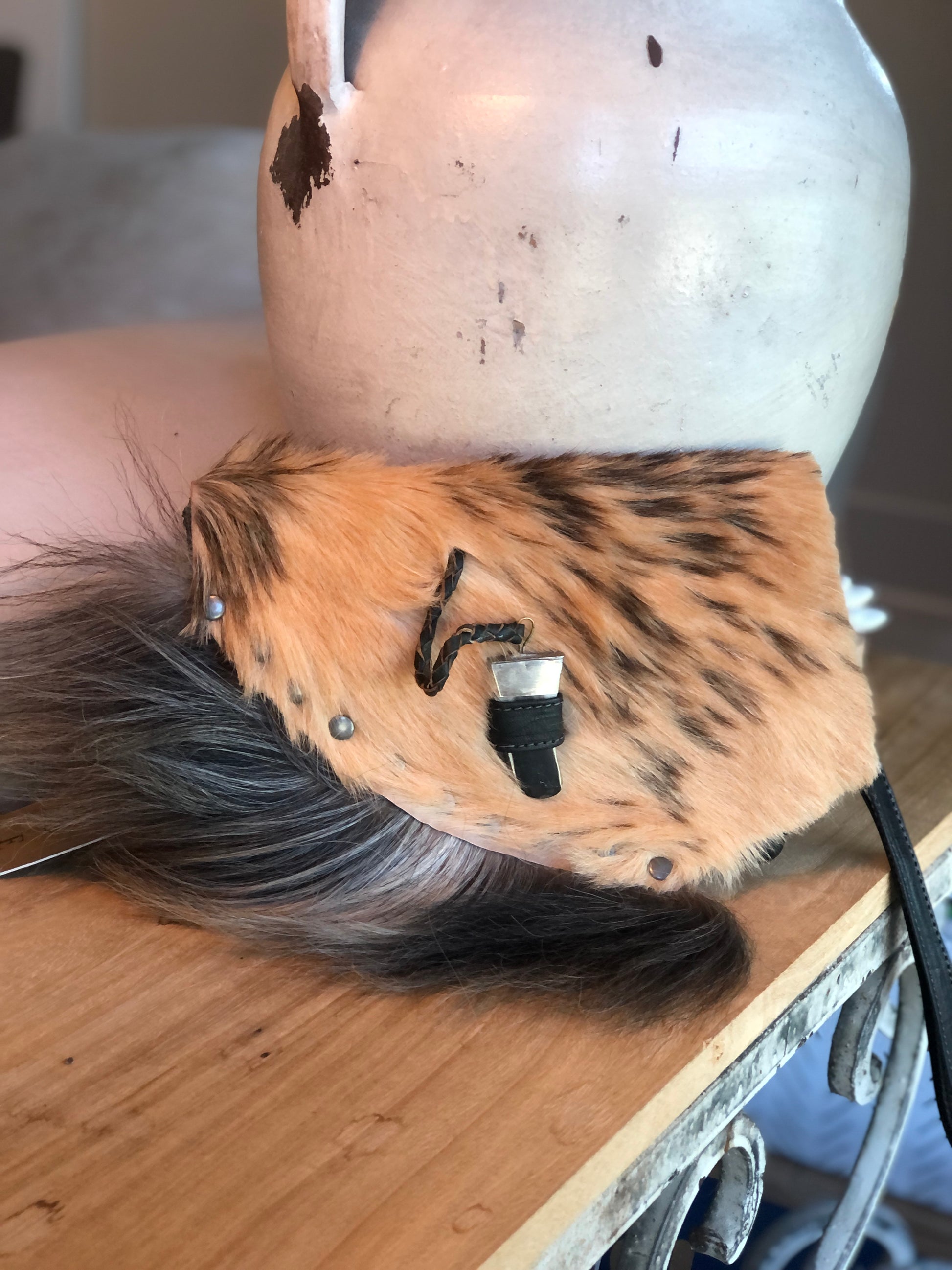 Cream / black short hair fur along with long hair New Zealand fur front . Black leather bag 3 zipper pockets. Comes with a wristlet and waist belt . 5x7